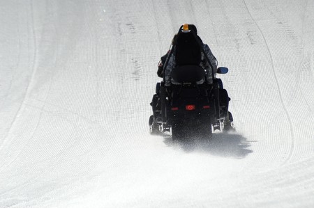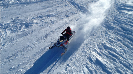 Snowmobiling in the mountains. A man is riding a snowmobile.