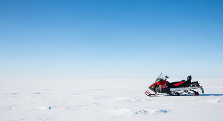 Snowmobile on vast winter snowfield under clear blue sky