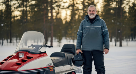 Elderly caucasian male with snowmobile in winter forest
