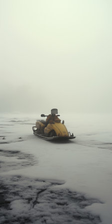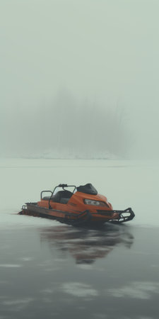 a snowmobile in the fog, captured in high definition wallpaper. the image showcases a unique blend of dark orange and aquamarine colors, reminiscent of the artistic style of flora borsi. the composition combines elements of marine painting and machine aesthetics, creating a captivating visual experience. shot on 70mm film, this photograph explores the textures and atmosphere of the scene. ai generated