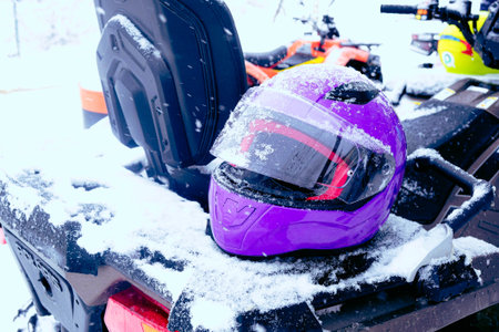 Winter entertainment. In the foreground is a snow-covered snowmobile without a driver, in the background people are riding quad bikes. Snow is falling. Selective focus.