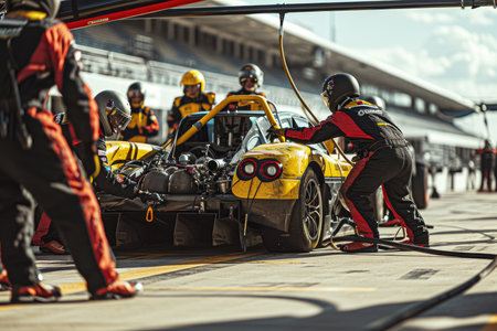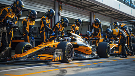 Efficient pit crew demonstrates ultimate teamwork during race car pitstop in the pit lane