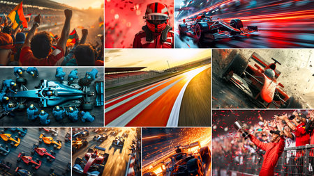 Collage made of different images showing aspects of motorsport. Racing car, sport fans, racers, pit stop crew, victory and failure.