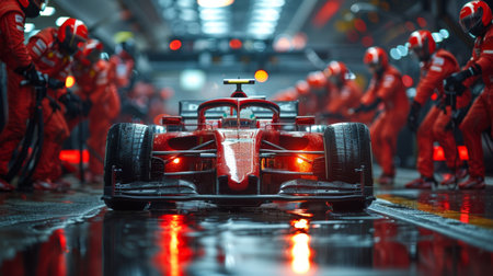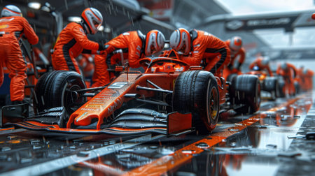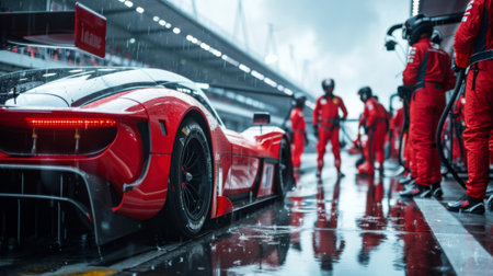 Race car pulls into pit lane on wet track, surrounded by focused pit crew in red suits. Teams swift and precise maintaining race performance.