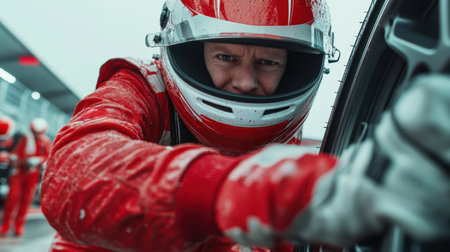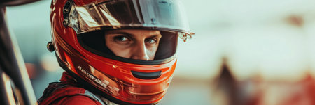 A professional racer wearing a helmet looks intensely focused before the race, embodying determination and readiness for the competition.