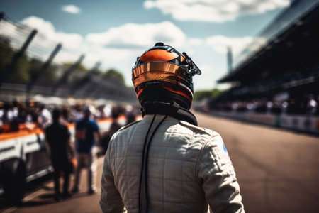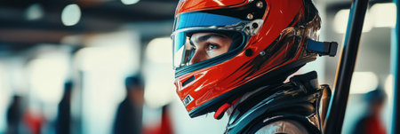 A determined racer wearing a helmet focuses intently on the upcoming race, showcasing passion and readiness at the racing venue.