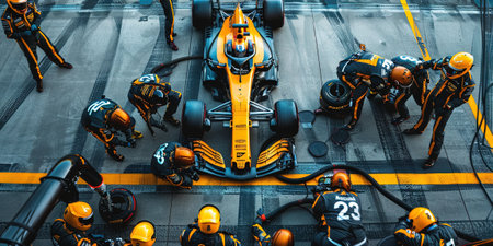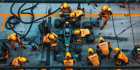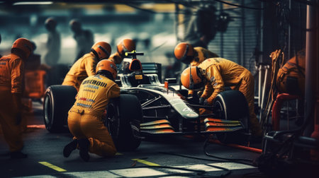 Formula 1 pit stop, accuracy and coordination of mechanics, quick service of a racing car. Generative AI