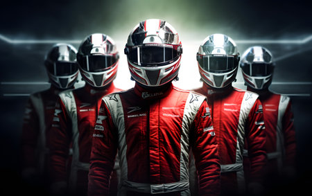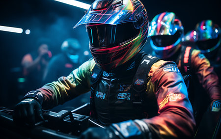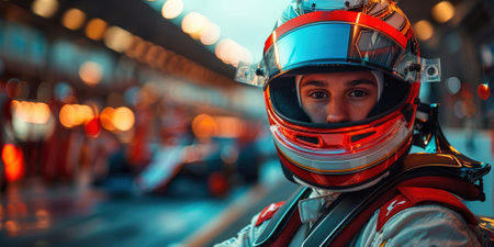 Portrait of a race car driver in full gear at the illuminated circuit, focus on safety and speed