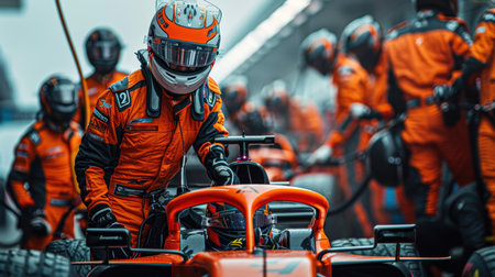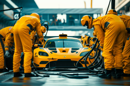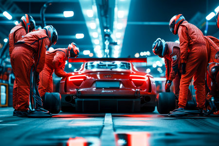 Professional pit crew in action with race car in pit lane, ultimate teamwork concept