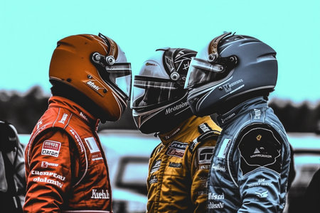 A close-up portrait of a race car driver wearing a helmet, ready for a high-speed race, exuding determination and focus. High quality photo