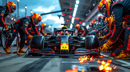High octane formula 1 pit stop maintenance with swift team performing car maintenance