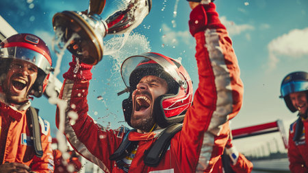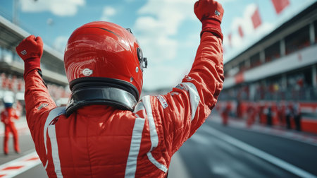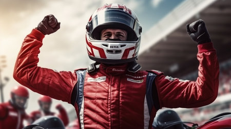 Race car driver celebrating a victory wearing a suit. Generative AI.