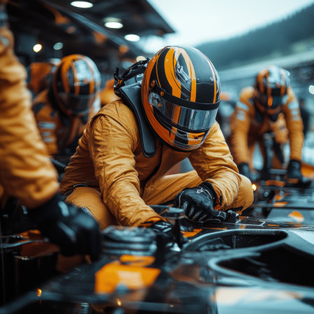 A sharp shot capturing the intense focus of a pit crew during a critical pitstop in a high-stakes race