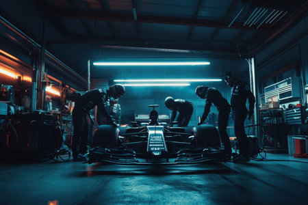 Manager overseeing pit crew servicing formula one race car in dimly lit garage environment