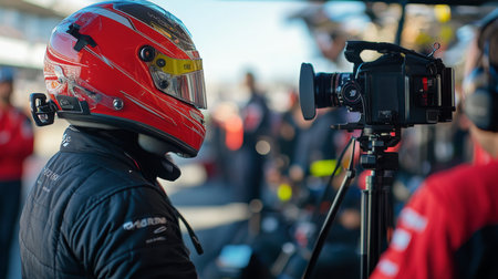 Race Car Driver Preparing for a Media Interview at the Track