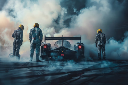 Racing team with a car in a dramatic smoky atmosphere