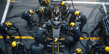 Professional pit crew in action. race car pit stop illustrating ultimate teamwork and efficiency