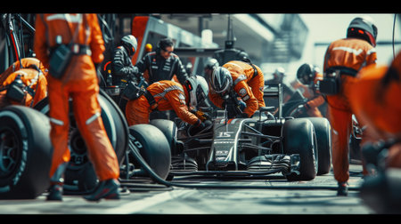 A group of mechanics in racing suits working on a Formula 1 car in a pit stop, with speed and precision emphasized, showcasing