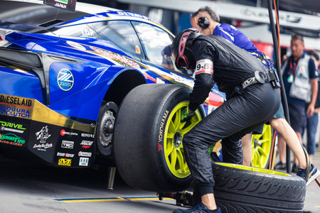 Buriram, Thailand - 28 June 2019 : Thailand SuperGT racing match, Japanese driver from some team have to practice changing wheels by their own too at the pit stop