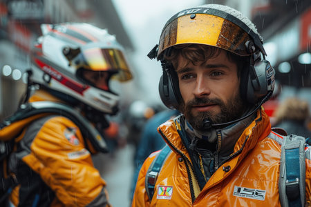 Race car driver in yellow jacket and helmet with visor down in rainy pit lane, blurred car and driver in background.