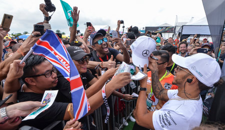 SEPANG, MALAYSIA : OCTOBER 01, 2017 : Lewis Hamilton of Great Britain and Mercedes AMG Petronas F1 Team signs autographs for fans before the Malaysia Formula One (F1) Grand Prix at Sepang International Circuit (SIC).