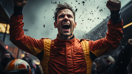 Racer celebrating victory on the race track in a suit. Generative AI.
