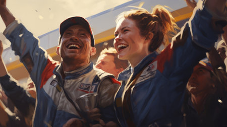 Race car driver celebrating a victory wearing a suit. Generative AI.