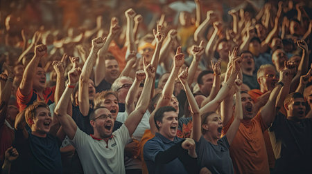 A diverse group of individuals standing together, raising their hands in a show of support and unity, A group of fans cheering and chanting in support of their team