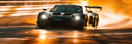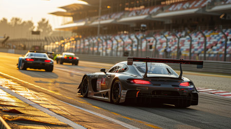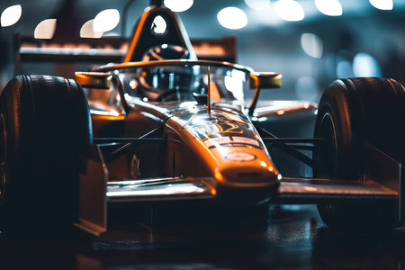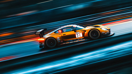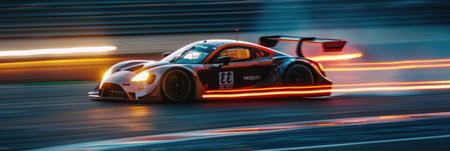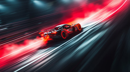A stunning close-up image of a race car positioned on a track, showcasing intricate details, motion blur, and dynamic lighting that emphasizes speed and competition.
