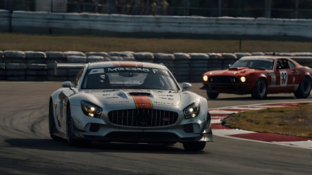Two sports cars participate in a race.