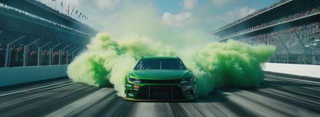 Green race car speeding down track, kicking up cloud of green smoke as it crosses the finish line with cheering crowd in background.