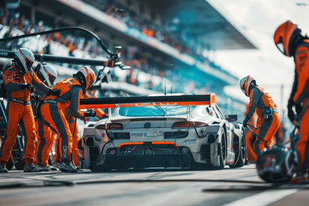 Professional pit crew at work as race car arrives in pit lane for pitstop, teamwork concept