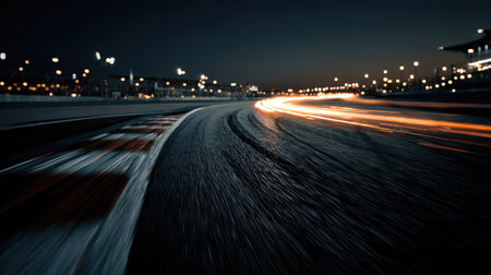 A striking nighttime image capturing the essence of speed on a race track, showcasing blurred lights and tire tracks that evoke a thrilling atmosphere.
