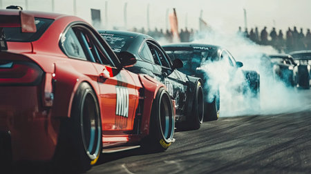 A powerful racing car performs a thrilling drift, creating dramatic smoke clouds on the asphalt. The image captures the essence of speed and adrenaline in motorsport.
