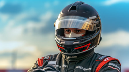 Portrait of a racing driver in a helmet. Generative AI