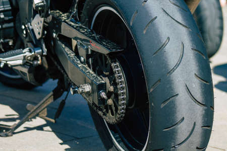 Reims France May 29, 2021 Closeup of the mechanics of a motorcycle parked in a parking lot located in the city center of Reims