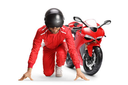 Racer in a start position for running in front of a red motorbike isolated on white background