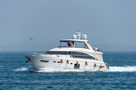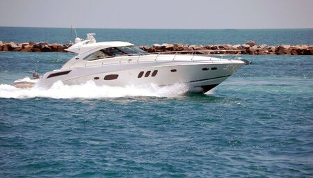 A luxury motor yacht in sea marina bay. Yacht in boat harbor. Private luxury boat for best summer vacation. Summer boat vacation. Boat yachting. Yacht vacation in summer. Marina bay. Marina club