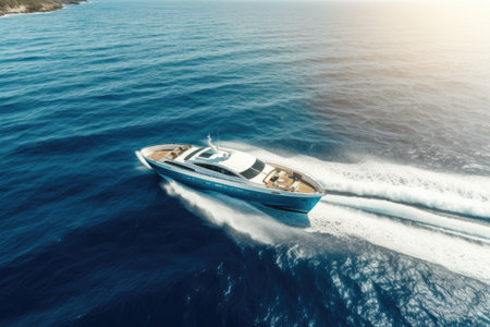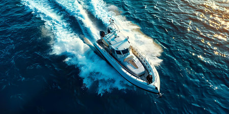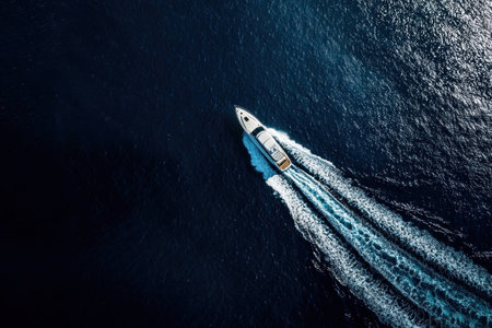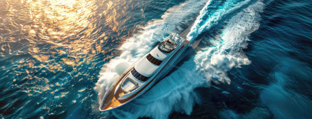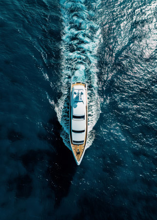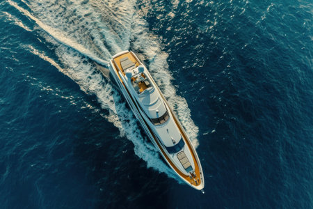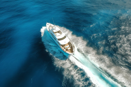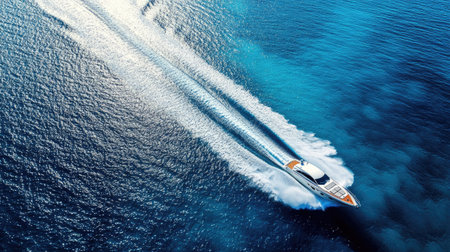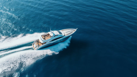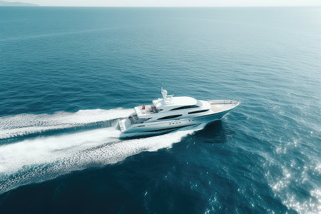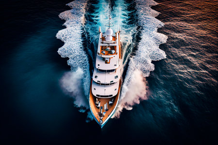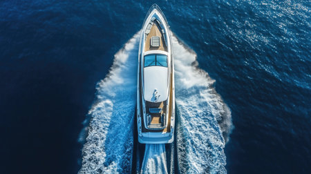Aerial view of a luxury yacht cruising on deep blue ocean waters, leaving a trail of white foam. Summer leisure and travel lifestyle concept.