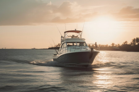 Ship, ocean and sea travel at sunrise for holiday, vacation and ai generated tourism on nature yacht