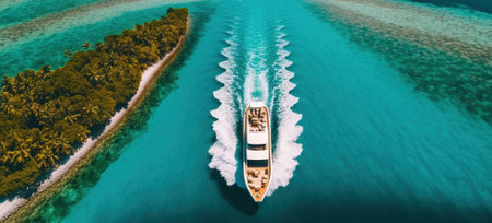 AI generative image of a luxury yacht sailing on a crystal water near the small island