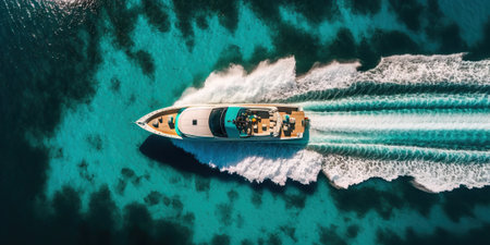 Top view on speed boat in paradise turquoise ocean water. Generative AI