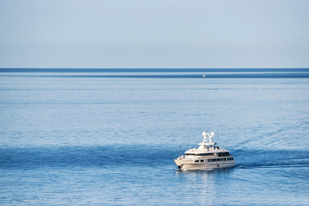 a white yacht sailing in the blue sea, dividing the horizon into two parts.