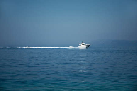 Modern yacht sailing on turquoise clear sea water in Cape Greco National Park, Cyprus