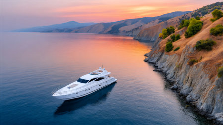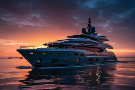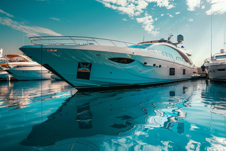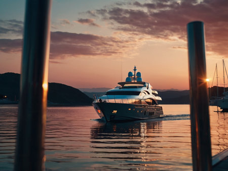 A sleek, modern yacht glides gracefully in the calm waters of a bustling marina. The vibrant sky reflects beautifully on the surface, creating a picturesque setting for a day of leisure and adventure.
