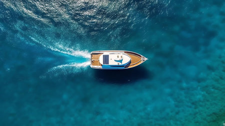 Captivating Aerial Shot: Motor Boat Serenely Cruising the Vast Open Sea