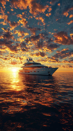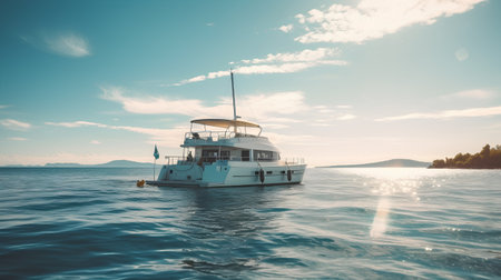 Luxury Yacht, Ocean Escape, Summer Sailing A sleek luxury yacht cruising through the clear blue ocean, with sunlight reflecting off