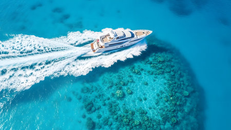Luxury yacht cruising through vibrant turquoise waters above a stunning coral reef