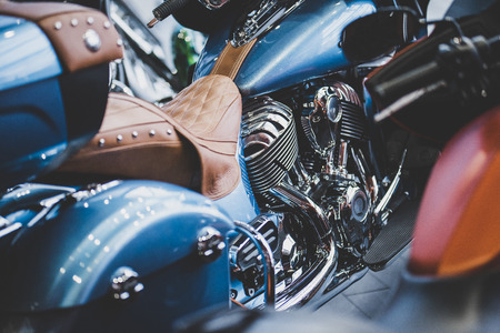 Motorbike with shining parts, close up. Motorcycle engine, toned