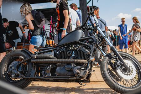 07.14.19 Belarus. Exhibition of old motorcycles in the open. editorial. Scrambler, cafe racer motorcycle, streetfighter. Gray color.